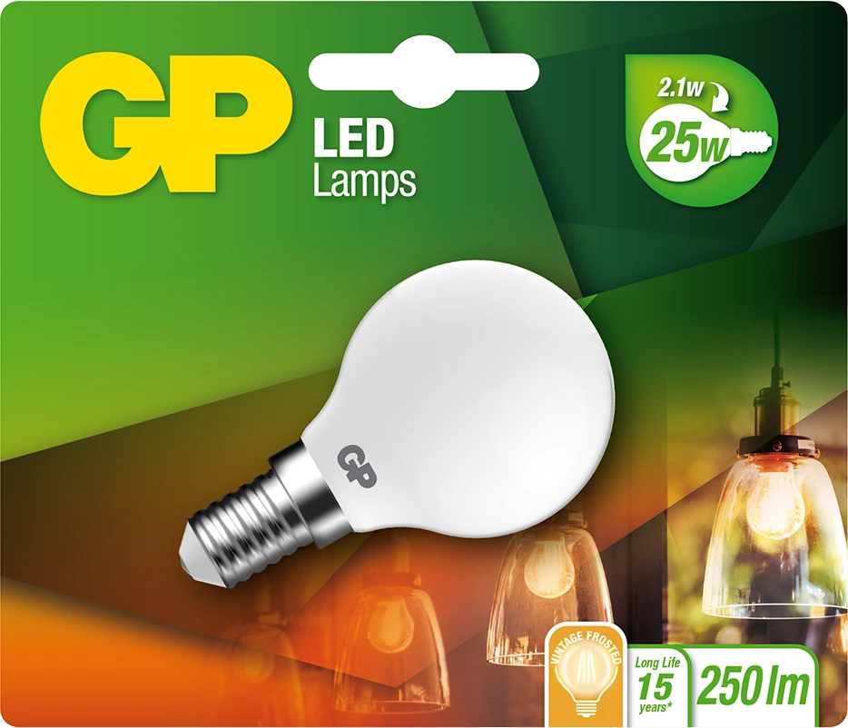 GP lampadina LED a filamento mini globo, E14, 2.1W (25W), 250lm, 080435-LDCE1
