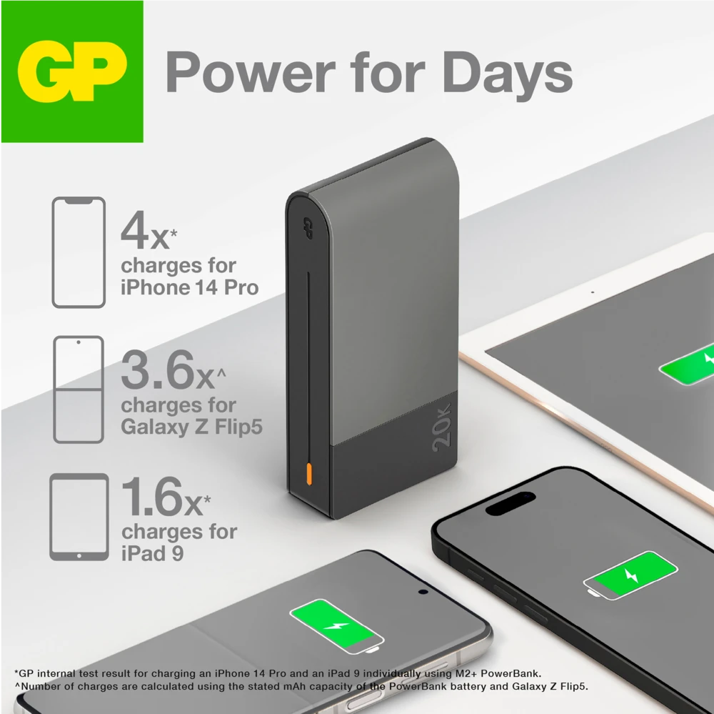 Håll dina enheter i gång hela dagen oavsett vad du gör. Din iPhone 14 Pro kan laddas upp helt fyra gånger*. Och dina hörlurar och din smartwatch ännu fler gånger.Låt M2+ bli din sidekick under vardagens alla äventyr.