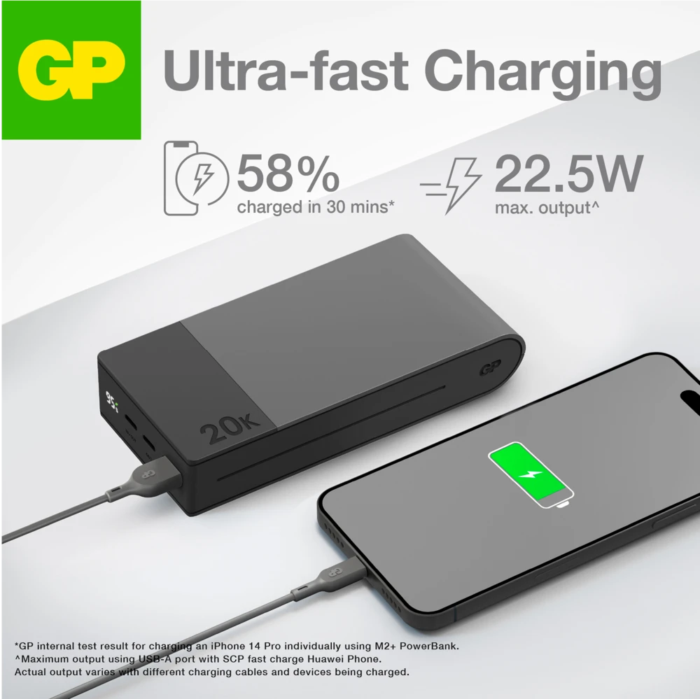 *GP:s interna testresultat för laddning av en iPhone 14 Pro med M2+ Powerbank.