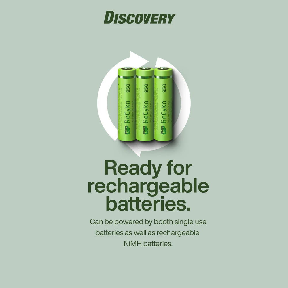 - Batteri: Alkaline / NiMH (3 x AAA)