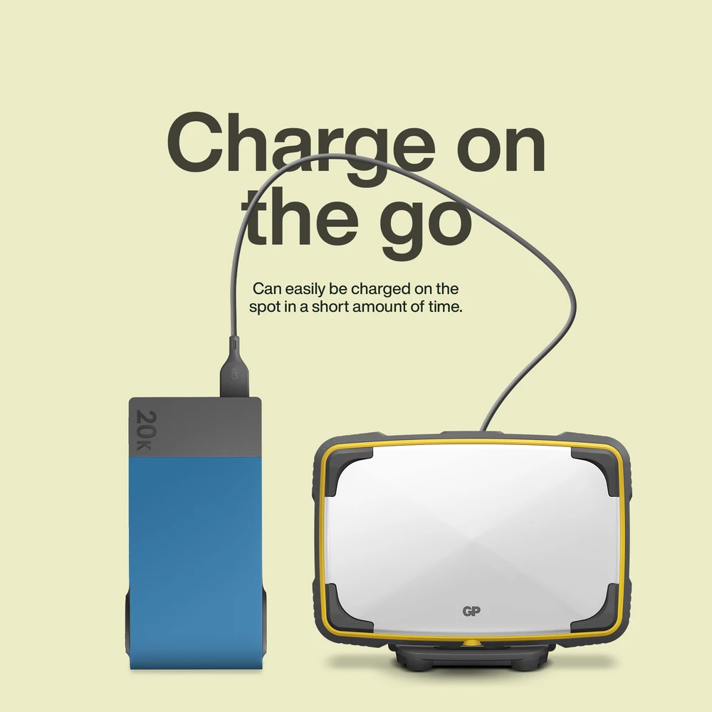 Var alltid uppladdad Arbetslampan är utrustad med ett inbyggt uppladdningsbart litiumjonbatteri (5100 mAh) med en batteritid på upp till 17,5 timmar. GP Discovery Work CWP15 har strömindikator så du vet när du behöver ladda upp din lampa. Den laddas med USB-C (kabel ingår) och kan vara igång på lägsta ljusläget under pågående laddning vilket ger oändlig batteritid. Antingen trådlöst i kombination med en powerbank eller direkt inkopplad till ett eluttag.