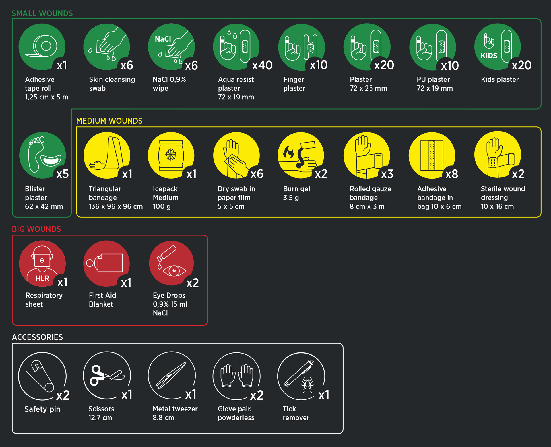 - Innehåller 152 delar för sårvård, brännskador, ögonirritation och mer