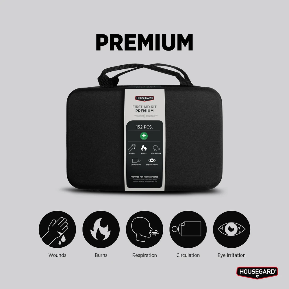 Housegard Premium är en omfattande första hjälpen-väska som täcker allt från små sår och brännskador till större skador, ögonirritation och akuta nödsituationer. Perfekt för hemmet, på resan eller för den som vill vara förberedd på allt.
