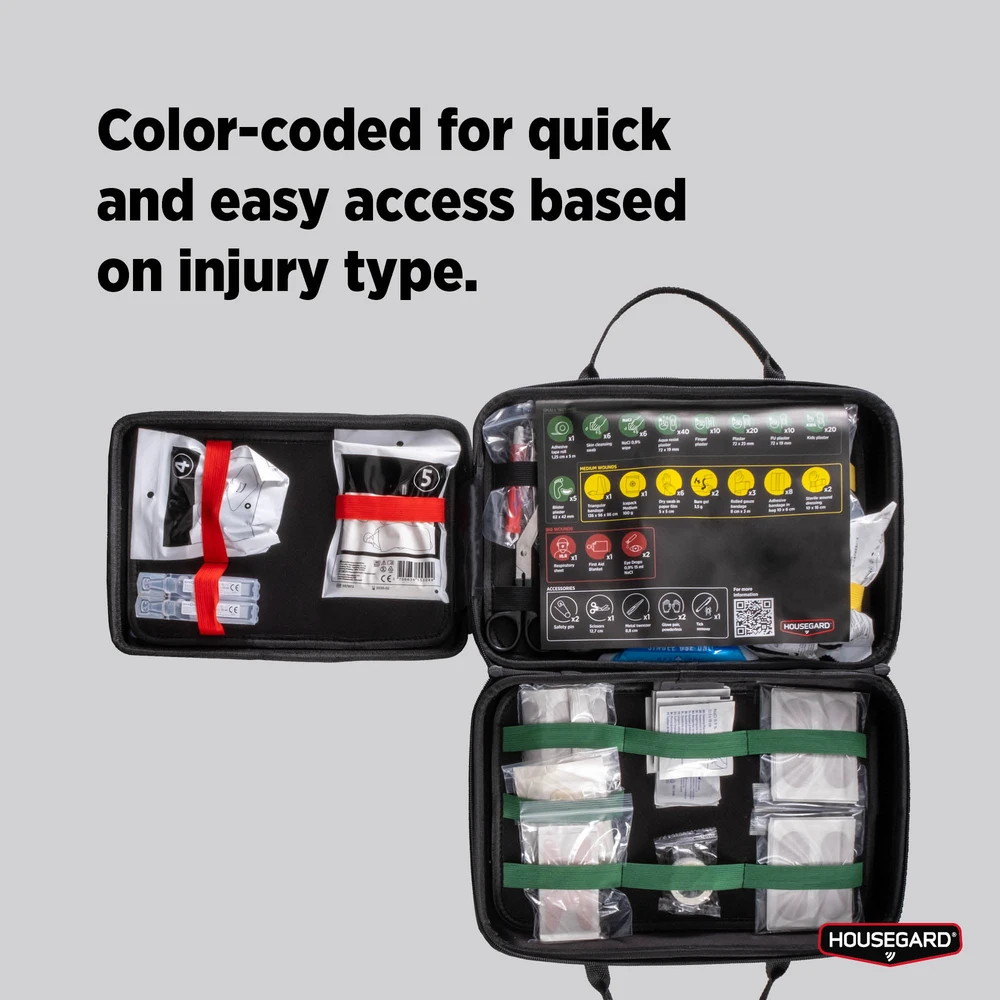 Housegard Premium är den mest omfattande första hjälpen-väskan i vårt sortiment, perfekt för att hantera både små och stora skador samt akuta situationer. Oavsett om det gäller småsår, brännskador, ögonirritation eller allvarligare skador, har du allt du behöver för att snabbt kunna ge första hjälpen.