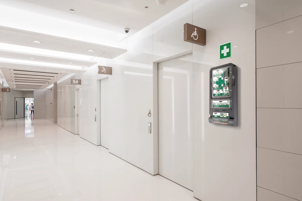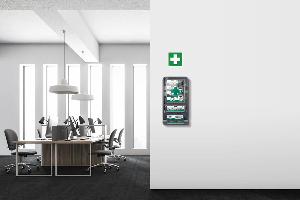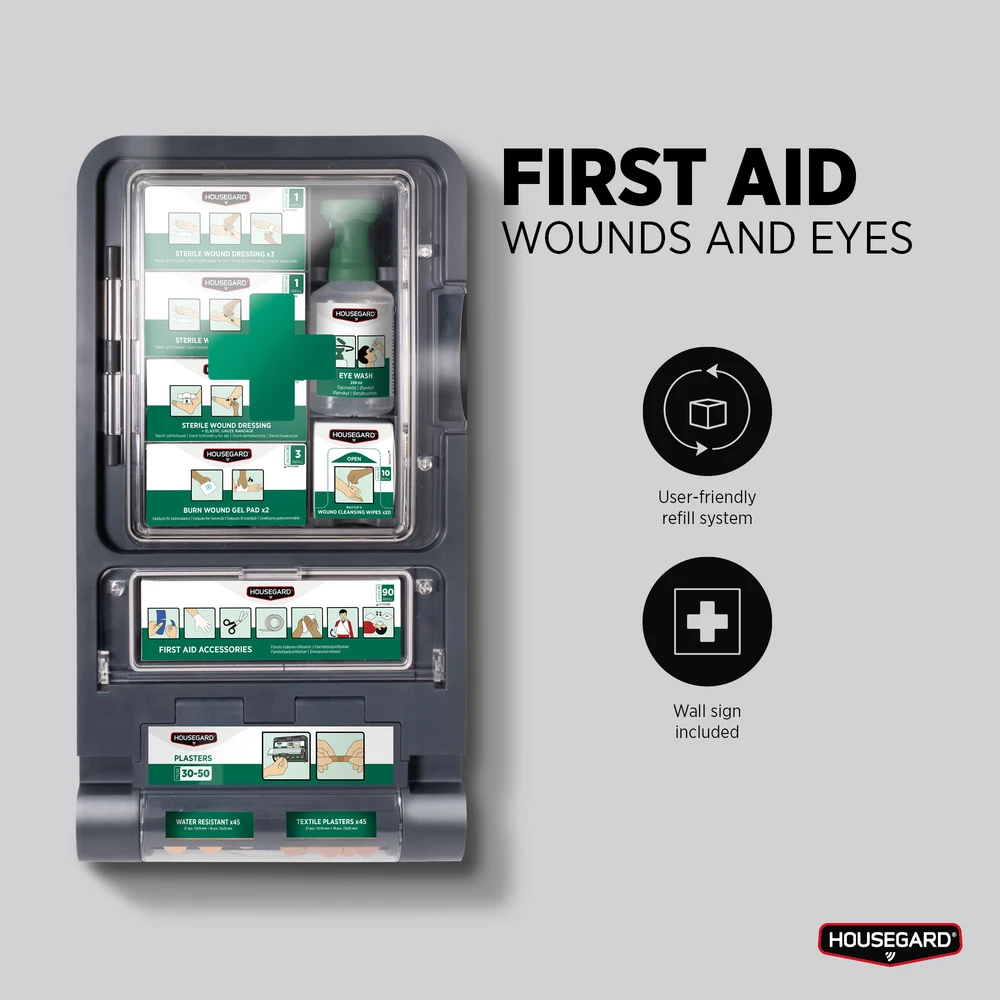 Första hjälpen-station för sårvård och ögonskölj med verktygsfri påfyllning och tydligt märkta refills. Synlig datummärkning gör service och kontroll enkel i arbetsmiljöer.