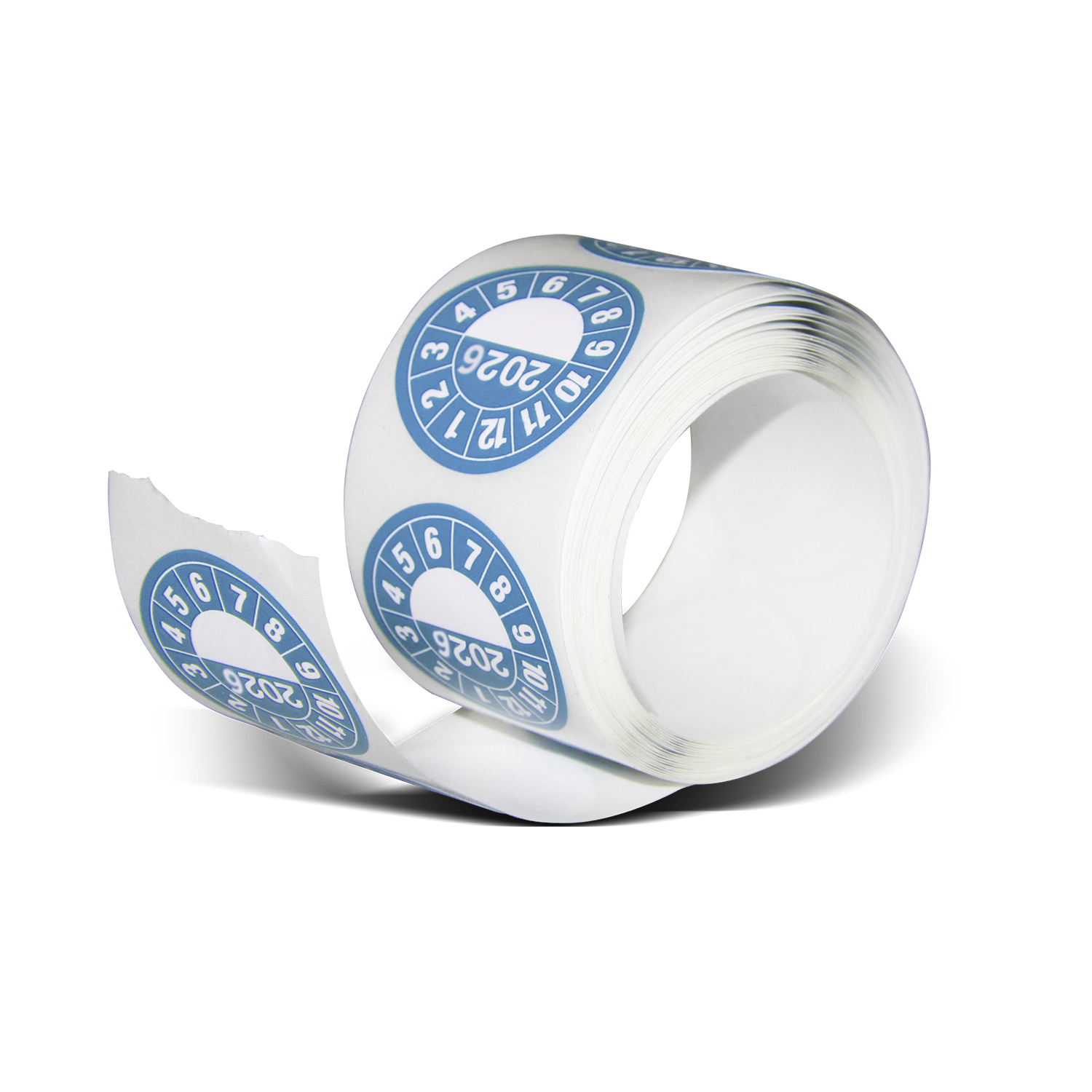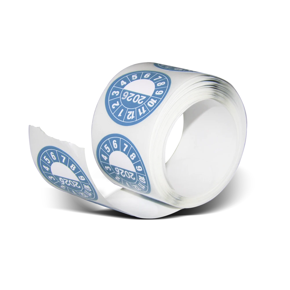 Serviceetikett med årsklocka för kontroll och underhåll av brandsläckare. För 2026 är färgen på etikett blå.