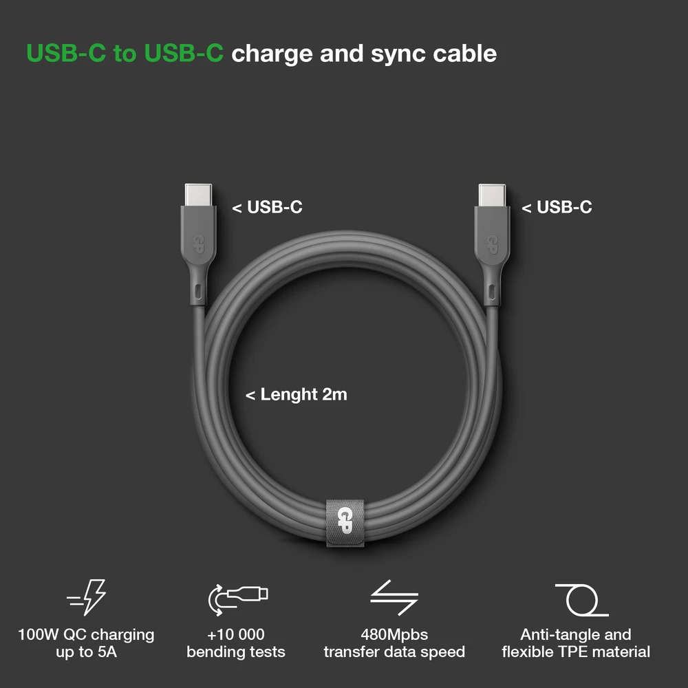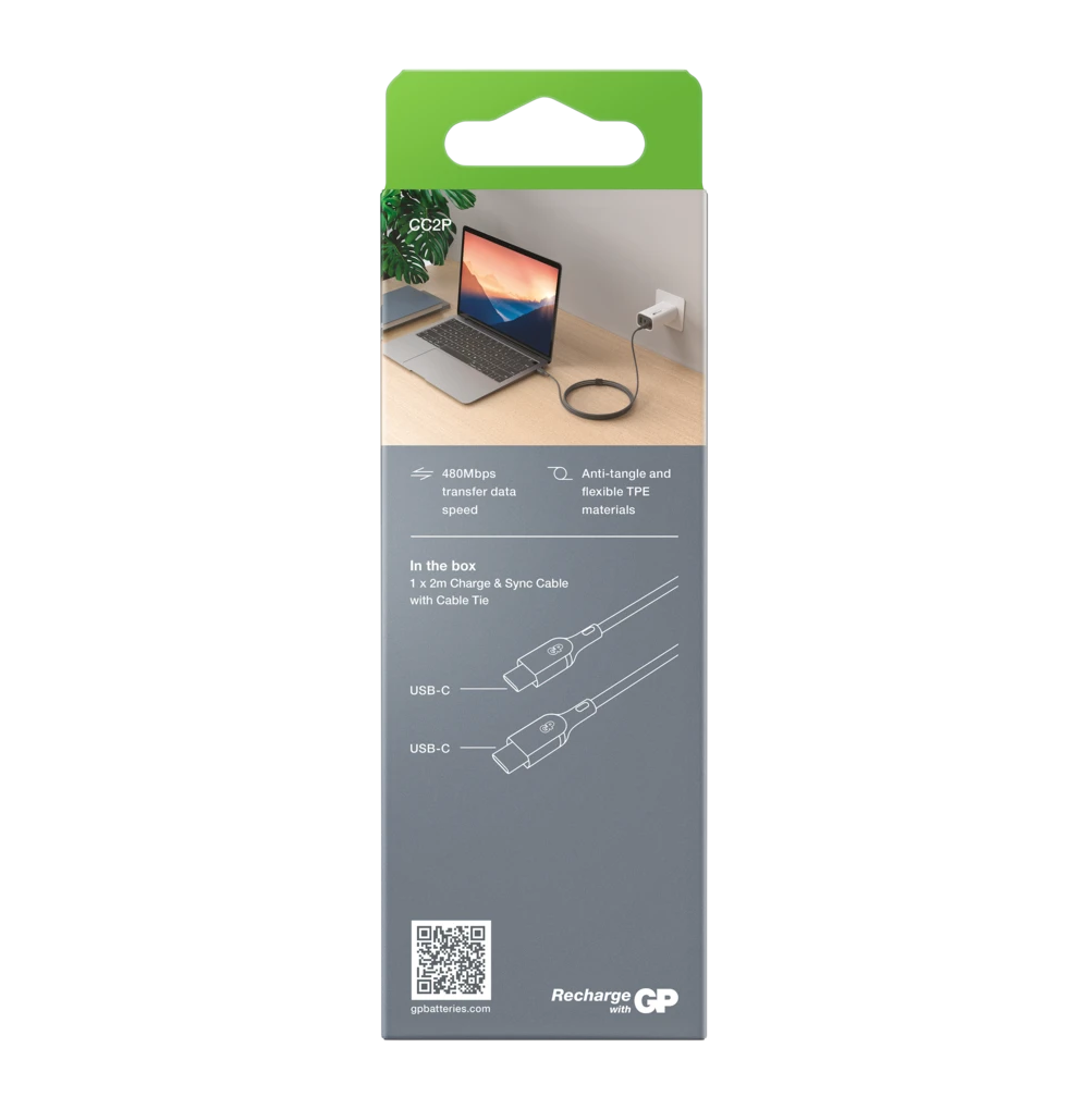 Charge & Sync-kabeln från GP är den perfekta kabeln för daglig användning. Kabeln är tillverkad av böjligt material som gör att den kan sträckas och böjas över 10 000 gånger utan att gå av. Den laddar en bärbar dator fullt på 1,5 timme.* Med stöd för Quick Charge och PD-laddning med maximal uteffekt på 100 W är den perfekt för en mängd olika applikationer. Kabeln kan användas för 480 Mbps höghastighetsöverföring av alla filtyper så att data kan överföras blixtsnabbt.