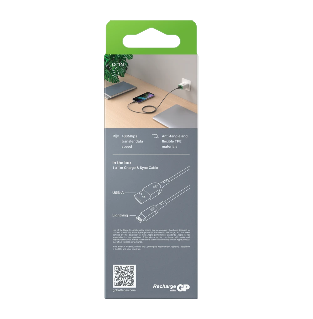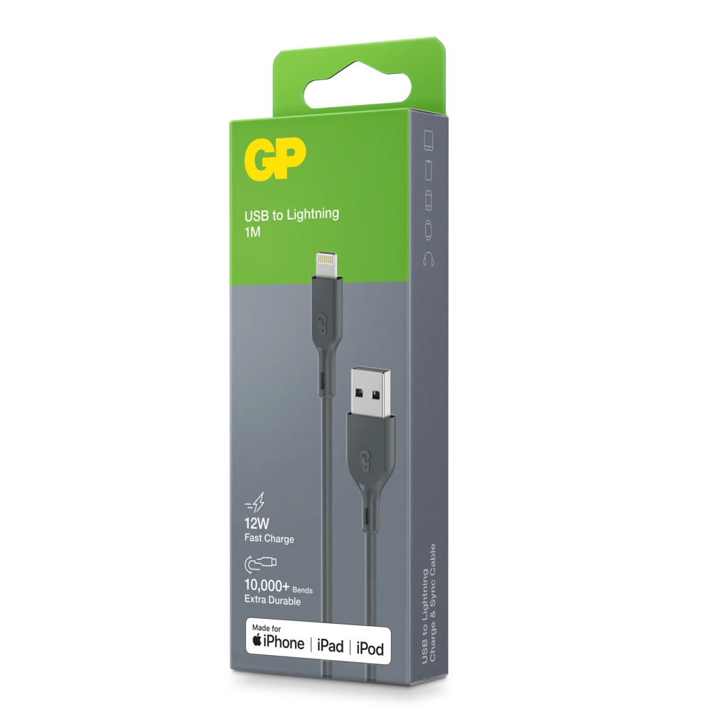 Charge & Sync-kabeln från GP är den perfekta kabeln för daglig användning. Kabeln är tillverkad av böjligt material som gör att den kan sträckas och böjas över 10 000 gånger utan att gå av. Den är MFi-certifierad och har en maximal uteffekt på 12 W vilket gör den perfekt för Apple-produkter. Kabeln kan användas för 480 Mbps höghastighetsöverföring av alla filtyper så att data kan överföras blixtsnabbt.