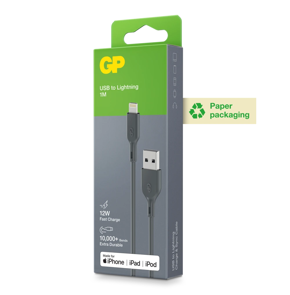 Miljövänlig förpackning Charge & Sync-kabeln från GP har en förpackning helt av papper, vilket belastar miljön mindre.