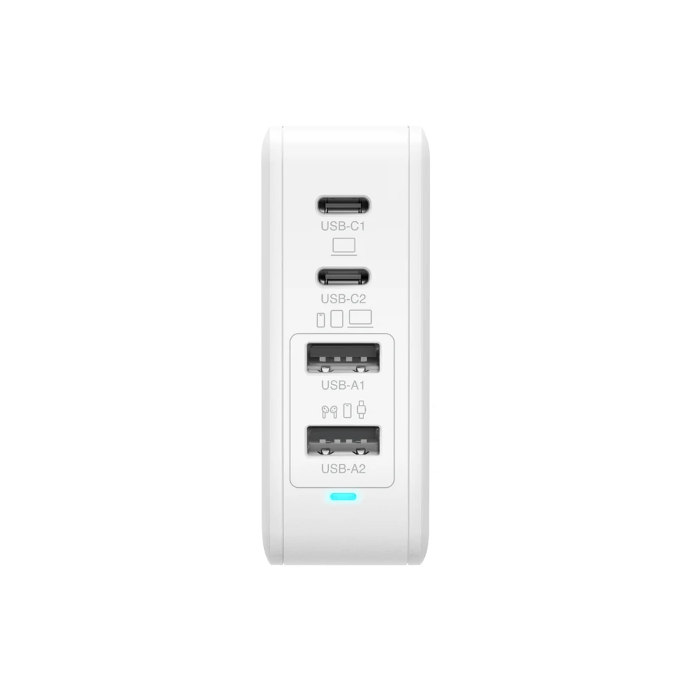 Ladda fyra enheter samtidigt – 100W GaN-laddaren med 4 portar gör det möjligt att ladda upp till fyra enheter samtidigt. Med två USB-C och två USB-A-portar kan du ladda laptop, smartphone, surfplatta och Bluetooth-hörlurar samtidigt, med endast en enda laddare.