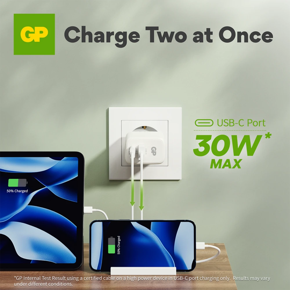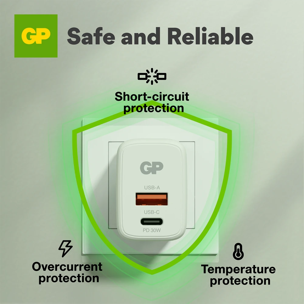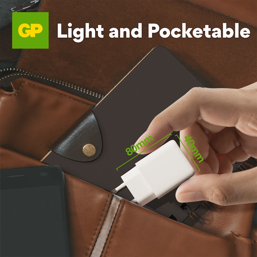 Med GP 30W Power Delivery (PD) väggladdare kan du ladda två enheter samtidigt. Den är så liten och kompakt att den får plats i fickan. Med ett pålitligt skyddssystem håller den dina enheter säkra under laddning.