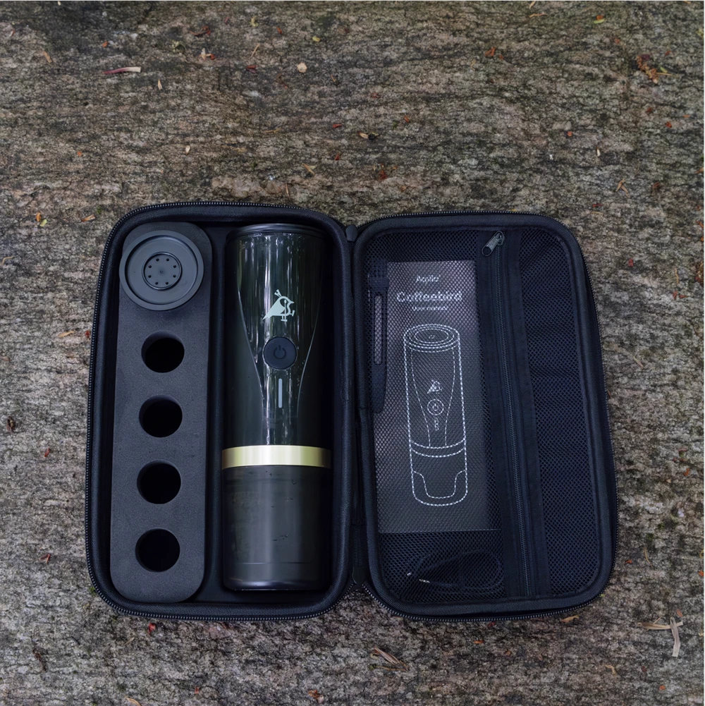 Coffeebird levereras med en praktisk förvaringsväska som gör det enkelt att bära med sig och förvara den.