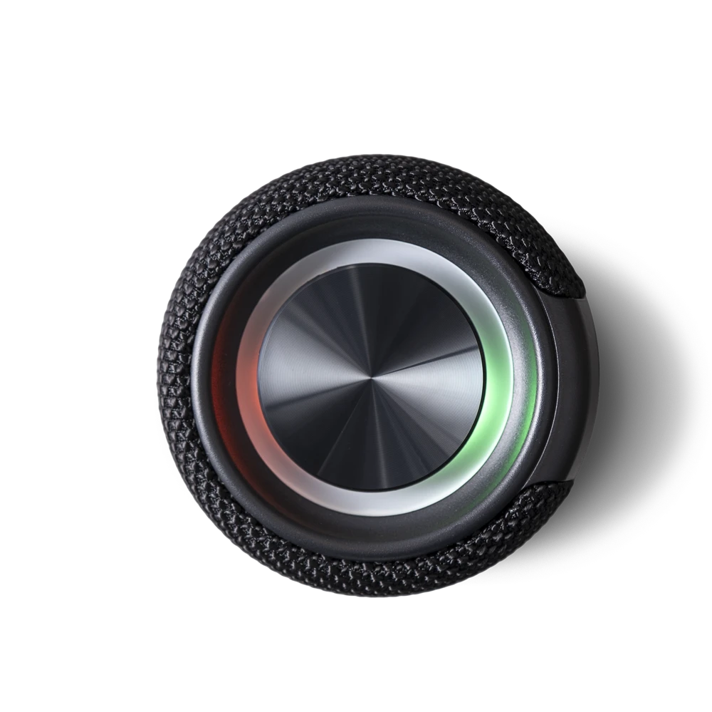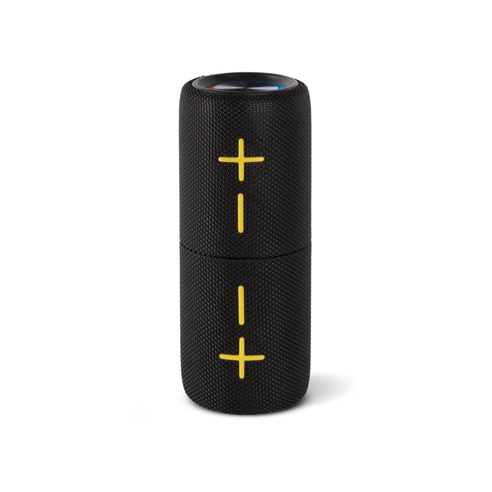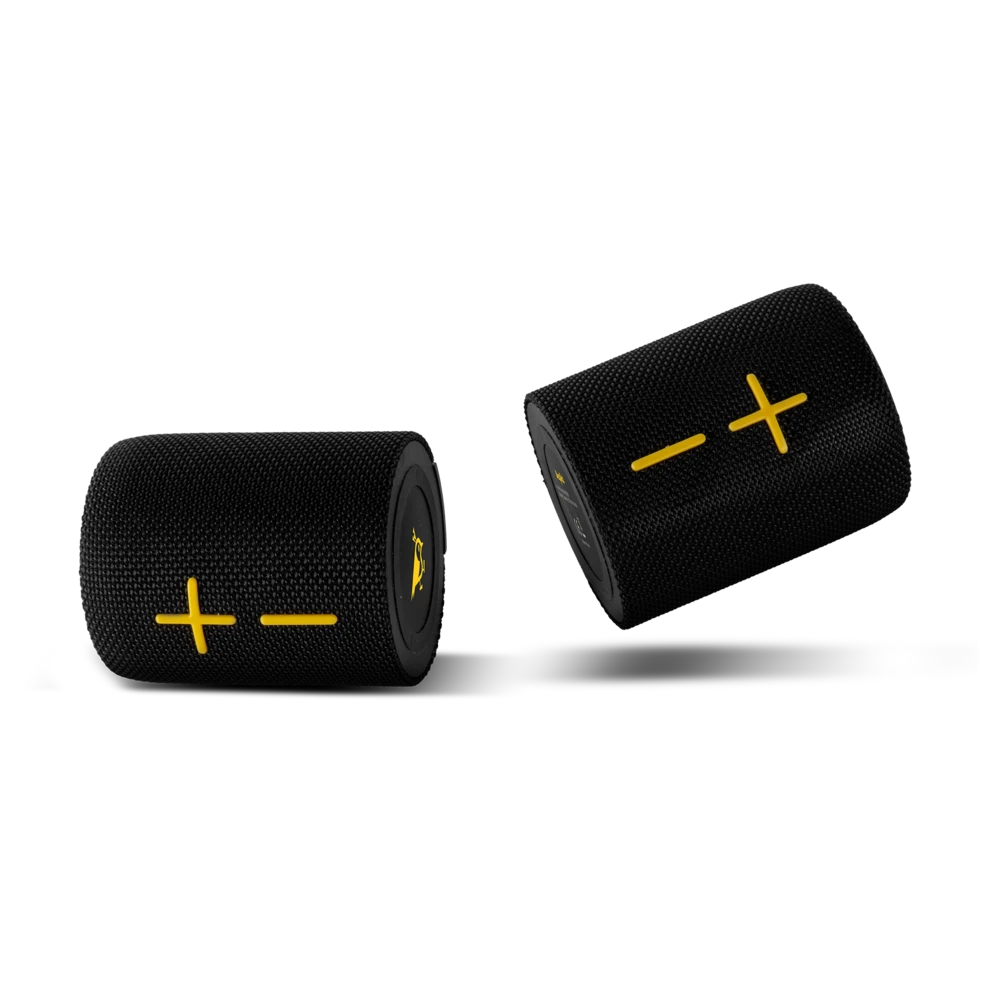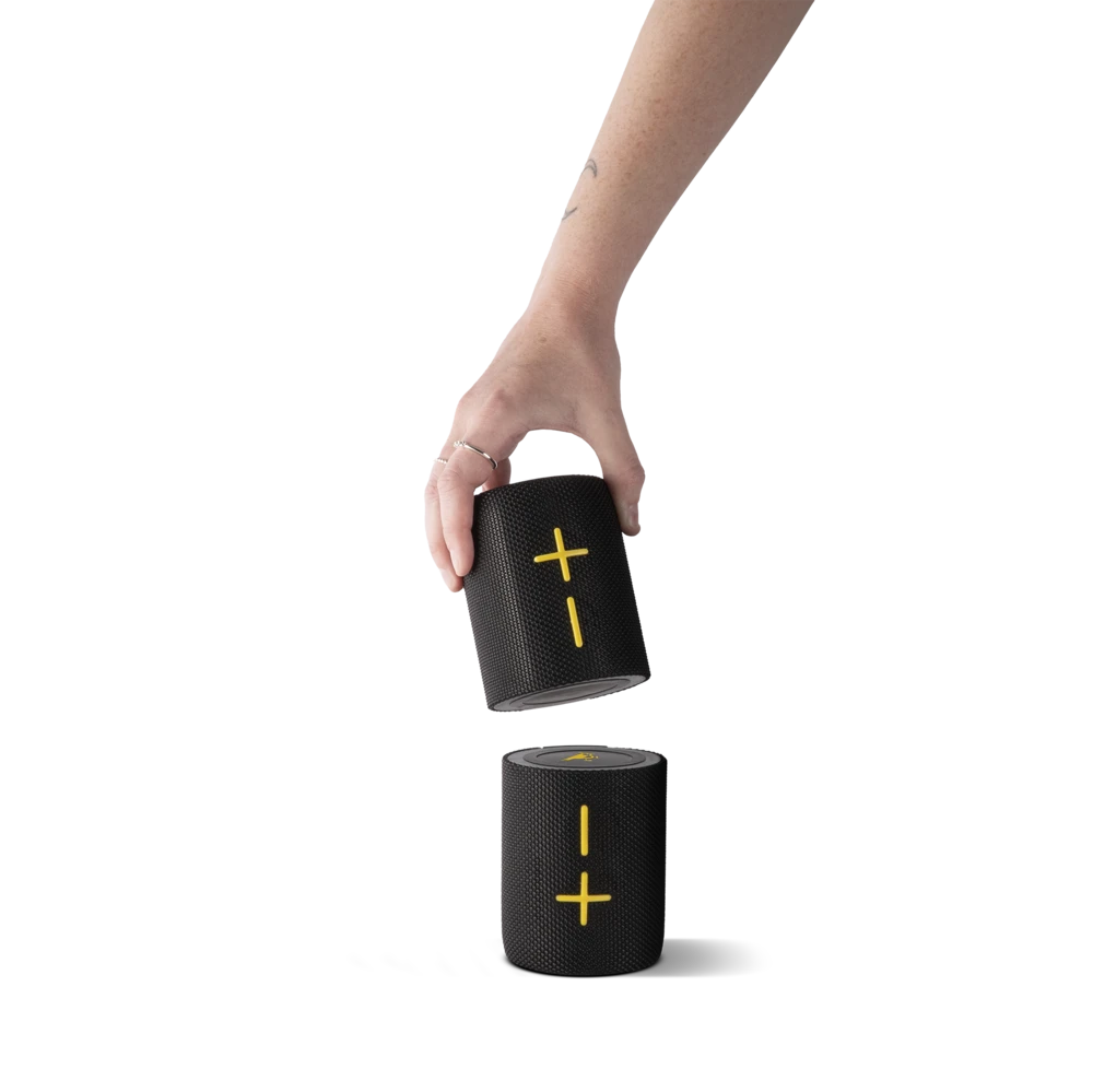 Bärbar 2-i-1 stereohögtalare som kan vridas isär till två trådlösa enheter. Vattentät och magnetisk som levererar omslutande ljud.