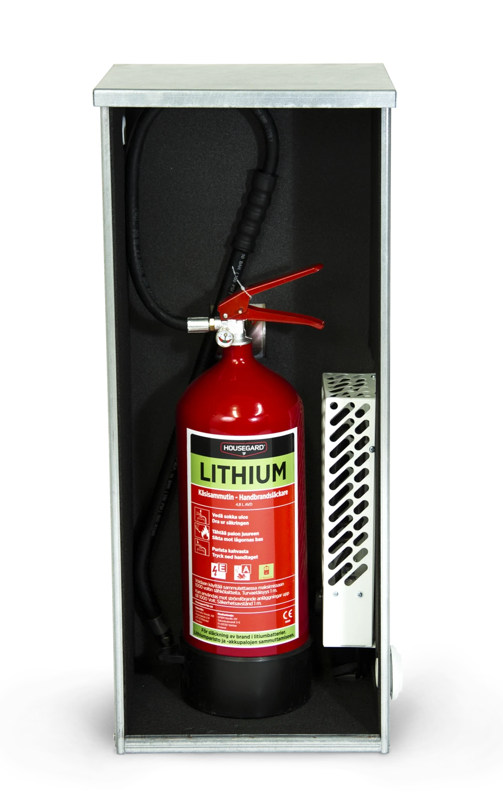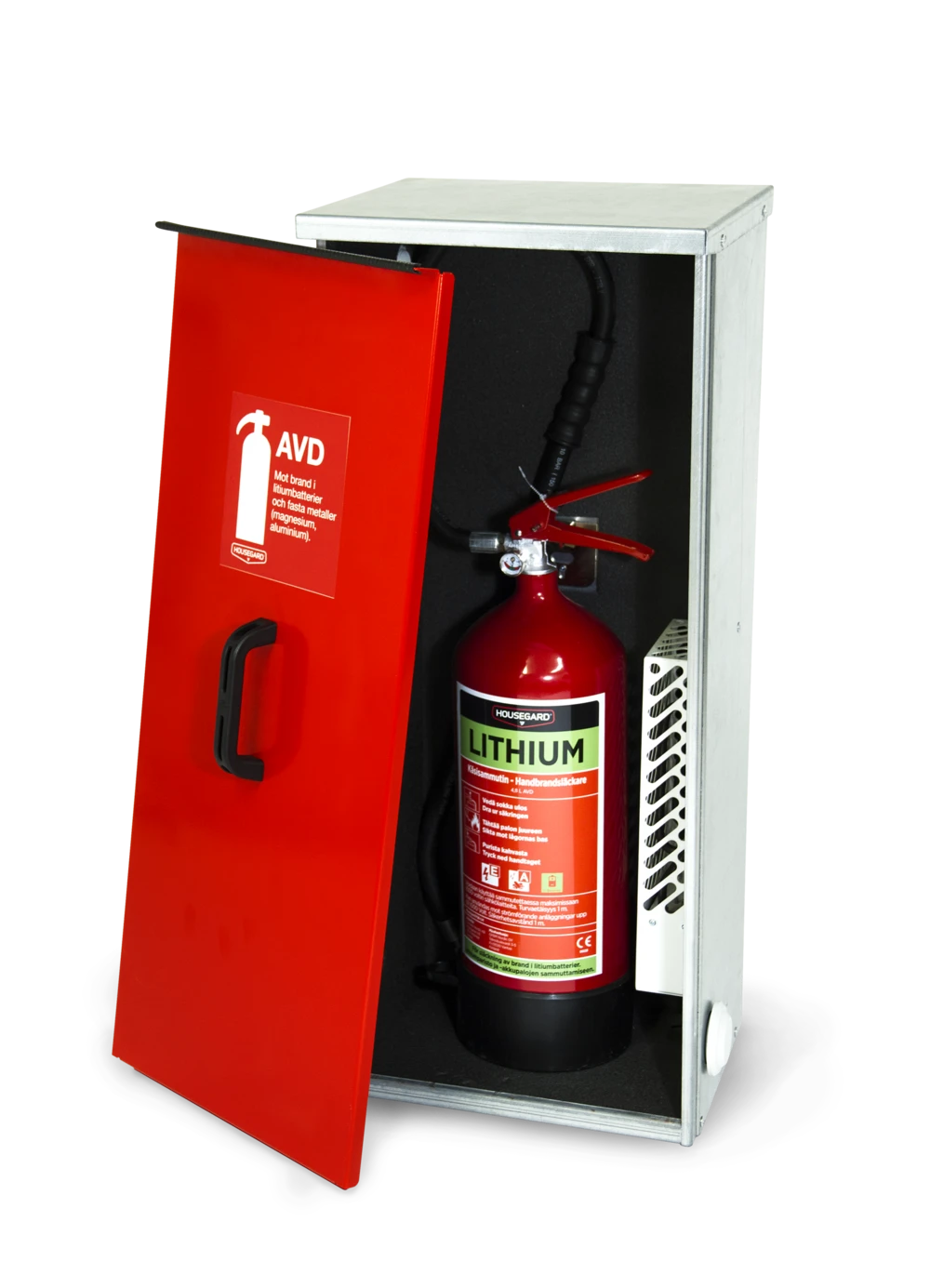 Värmeskåpet håller brandsläckaren frostfri och skyddar även mot väder, smuts och föroreningar. Typiska användningsområden är återvinningsbranschen, industrier och andra utsatta platser där temperaturen kan sjunka under 5 °C.